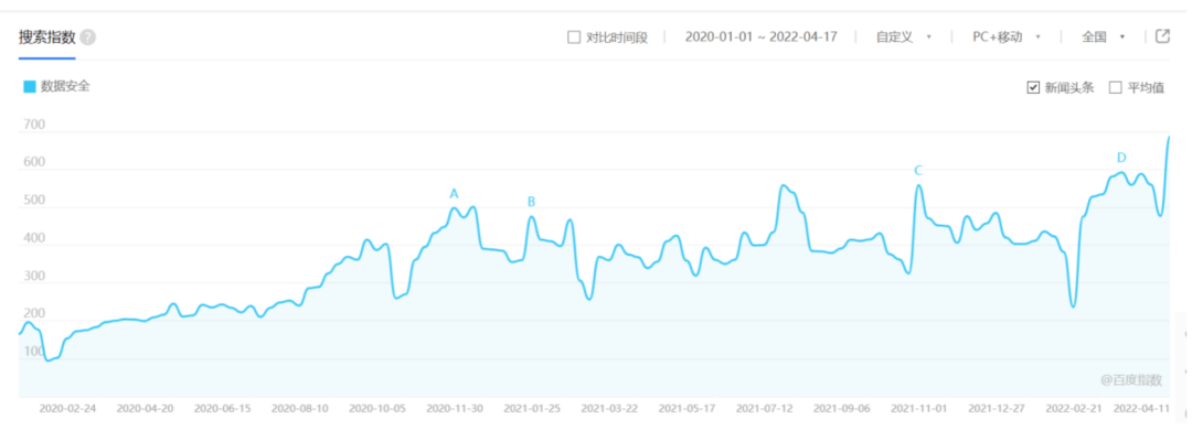 随着银行同业竞争不断加剧,以用户为中心、以数据为驱动、以场景为依托、以满足用户需求和实现生态闭环为目标的数字化经营日益成为银行竞争的新赛道,银行业收集的数据,早已不局限于金融资产余额、账户变动等金融数据,越来越多的非金融交易数据在银行沉淀。银行收集的数据范围越来越广、数据粒度越来越细,无疑成为全社会可信度最高的一类数据源。与此同时,公众对数据安全的了解和重视程度也在不断加深,百度指数如图1所示,数据安全关键字的搜索指数近年来呈稳步上升态势,银行与客户间的各类信息泄露和隐私保护类纠纷也屡见不鲜,可以说银行数据安全能力,已成为同业竞争力的重要组成部分。