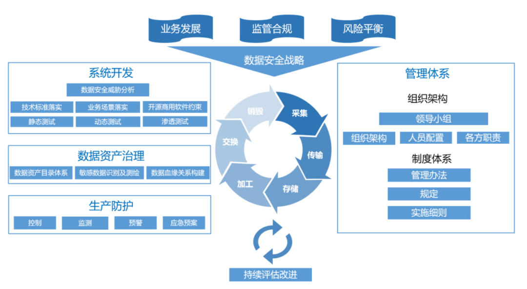 面对强监管的背景、日益复杂的数据安全形势,建设银行坚守合规底线,通过构建机制细化流程、数据安全与信息系统同步建设、提升数据资产治理水平、完善网络及数据安全防护体系、持续评估改进数据安全管理能力,构建企业级的数据安全治理体系,如图2所示。通过上述措施平衡业务发展和安全风险的关系,具体来说包含以下方面。