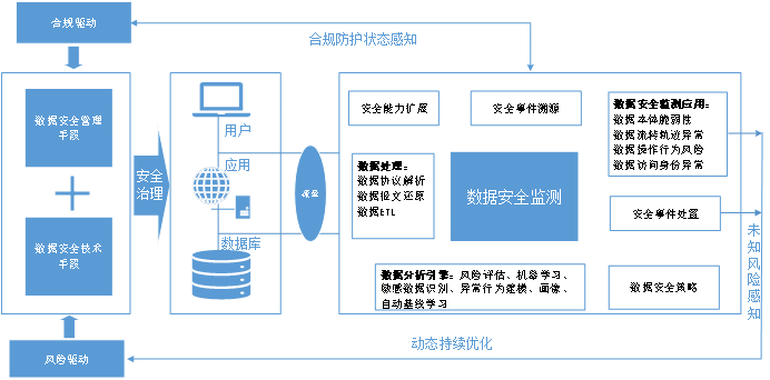 可通过Agent、SDN引流、流量镜像等多种流量采集手段,覆盖业务应用前后端数据资源访问的网络流量,聚焦数据、人、行为的特征的合规性及潜在风险进行深度分析,形成数据全链路流转过程的安全监测与风险感知能力,系统包含数据采集能力、数据识别能力、风险识别分析能力、预警处置能力、溯源取证、安全策略管理能力等,并具备高度开放扩展能力,以联动安全防护能力或调动安全制度处理流程,实现安全事件的闭环处置。如图1所示。