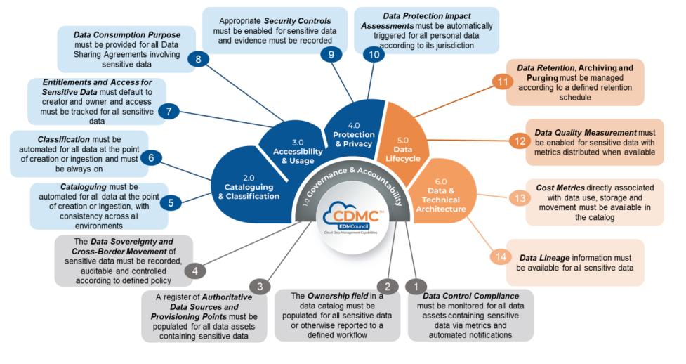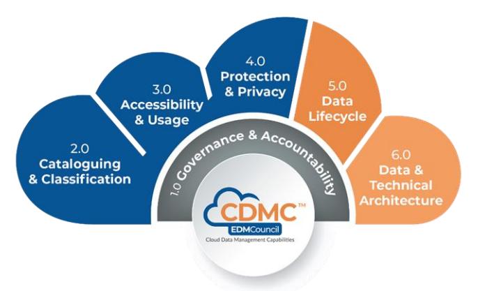 在CDMC框架的v1.1版本中,共分为6个不同的组件部分,包含14个功能和37个子功能。这些功能为可以帮助企业更安全地管理云上的数据,遵守全球隐私法,并实现自动化以增强数据管理和治理。